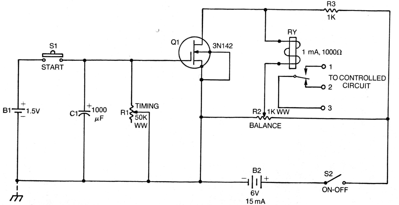 This timer for small intervals, but which can be increased with the increase of R1, was obtained in an American technical documentation from 1976. The MOSFET admits equivalent and the supply is double. The relay must be of the high sensitivity reed type with a trigger current of 1 mA. Modifications to the circuit can be made to accept more modern components.