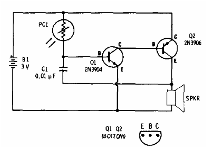 We found this experimental musical instrument in a 1977 Radio Shack brochure. The sound produced depends on the shadow made on the sensor which is an LDR. The transistors can be BC548 and BC558. The circuit works with voltages from 3 to 9 V. The basic frequency of the sound can be modified in C1 and the speaker is 8 ohms.