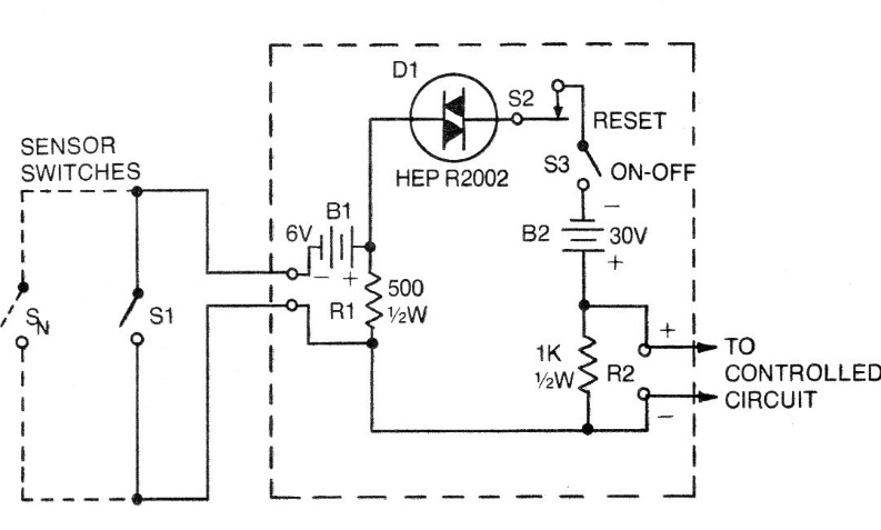 I found this circuit in a documentation about thyristors from the 70s. The circuit uses a diac with a trip voltage of approximately 30 V, but it can be implemented with diacs of other voltages. The circuit locks when a sensor is momentarily triggered. The output signal for control of the external circuit is approximately 1 V.