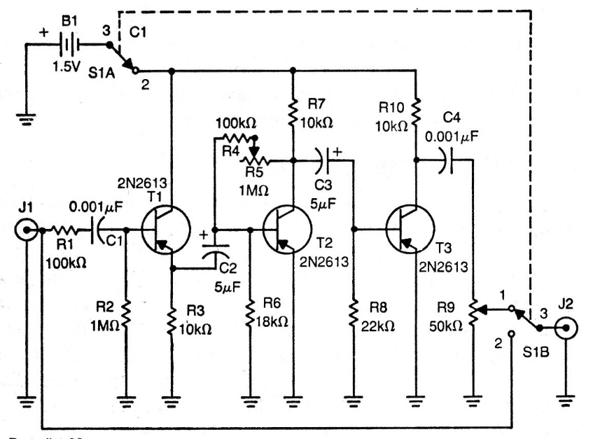 This distortion circuit was found in an American publication from 1970. It can be assembled with more modern transistors like the BC558. It is fed by a single battery. The signal input and output cables must be shielded. Adjustments are made in the two potentiometers. The output can be 47k instead of 50k since this value is not common.