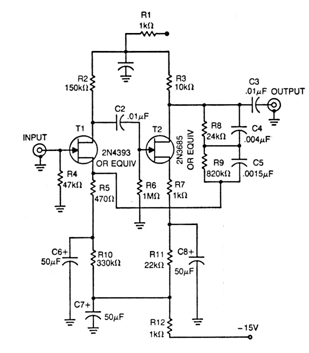 This circuit is from an old American publication, but it can be easily implemented with modern transistors like the BF245 or even the MPF102. The circuit has NAB equalization and low consumption, being powered by a symmetrical 15 V source. The signal input and output cables must have excellent shielding and the source must also have good filtering, so that no snoring occurs. For the stereo version, two units must be fitted, one for each channel.