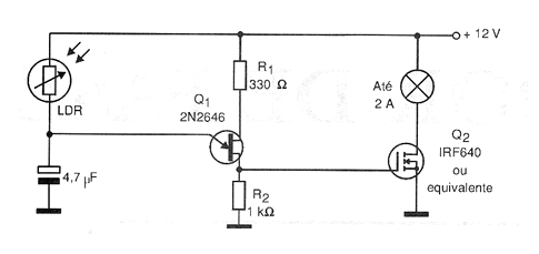 The circuit shown in the figure is sensitive to light. Its frequency is determined by the light intensity that strikes the sensor, in this case a common LDR. When using it, care must be taken that the light from the lamp it controls does not re-feed the sensor (LDR), which would cause unstable operation. The assembly of the LDR in an opaque tube with a lens increases its sensitivity and directivity, avoiding the indicated problems.