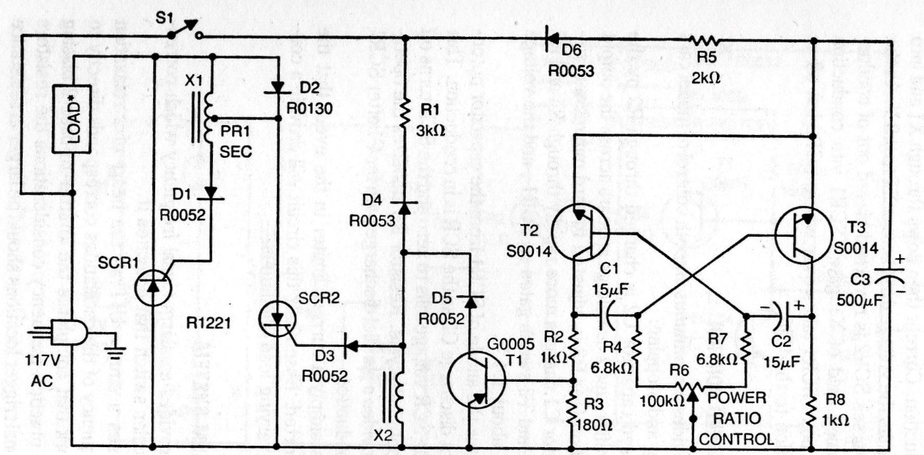 This full-wave power control was found in an old American publication. After adaptations and component changes are made, it can be easily assembled today. The SCRs are of the TIC106 type according to the power network and the transistors can be the BD136 for T1 and BC558 for the others. SCRs must be equipped with heat sinks and X1 is a pulse transformer with a 1 to 5 turn ratio for SCRs to trigger.