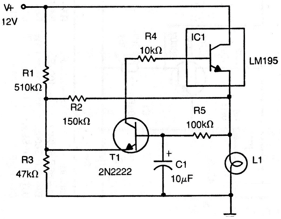 This circuit was found in an old American publication. It makes use of an integrated circuit consisting of a power transistor. We can elaborate the same configuration with a 1A Darlington or even a common transistor like the TIP31. The circuit is suitable for automotive use. The T1 transistor can also be a BC548.