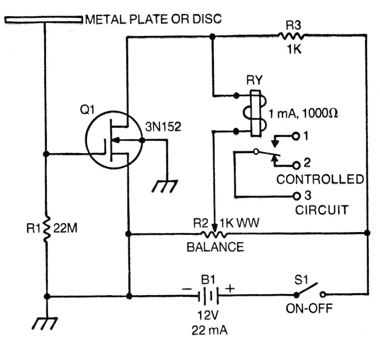 This circuit, from a 1976 documentation, uses a low power MOSFET that is difficult to obtain, but equivalent components can be used. The circuit triggers a highly sensitive reed relay (1 mA) when touching the sensor board. The circuit is powered by a voltage of 12 V, preferably battery. The circuit can be adapted to work with 9 V with a common FET like the BF245.