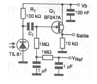 In the circuit shown in the figure, the diode operates in the generator mode, that is, generating a signal voltage when the modulated radiation occurs. This voltage appears over the load resistor R1 and is applied to the gate of the junction field effect transistor via capacitor C1. The resistor values are determined by the characteristics of the signal that must be captured and by the photo diode used.