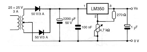 The power supply shown in the figure provides output voltages in the range of 1.2 to 25 V with currents up to 3 amps. The voltage regulator integrated circuit can be presented in a metallic housing TO-3 or plastic TO-220, but in both cases it must be equipped with a good heat radiator. The 100 nF capacitor as well as the 1 µF capacitor must be mounted as close as possible to the integrated circuit. The transformer has a primary winding according to the power grid and the diodes can have currents greater than those specified. This circuit is suggested by National Semiconductor.