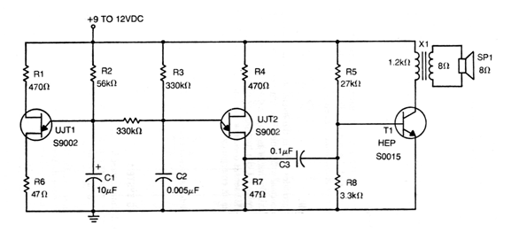 This circuit, from an old American publication, can be modified for better performance with more modern components. For example, instead of the original T1 we can use a TIP41 and directly feed a low impedance speaker without the need for a transformer. Changes in R8 may be necessary to obtain a lower resting current. Resistors R2 and R3 determine the sound effect and can be changed over a wide range of values. For the original version, use a BC548 on the output and a small transformer obtained from an unused transistor radio.