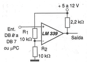 Voltage comparators, such as those in the LM139 / 239/339 series, consist of devices that can be used with advantages such as circuit interfacing elements with the parallel port of a PC or the output of a microprocessor. In the figure we show the simplest way to do this, that resistors fixed in the input polarization.