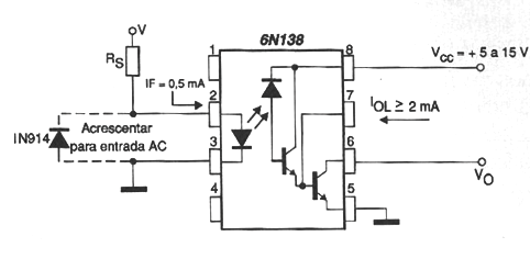 The circuit shown in the figure can be used as an indicator of presence and high voltage in a power line of any type. The operation can be done either from continuous or alternating voltages, whose value determines the resistor Rs, according to the following table. Output is TTL compatible.
