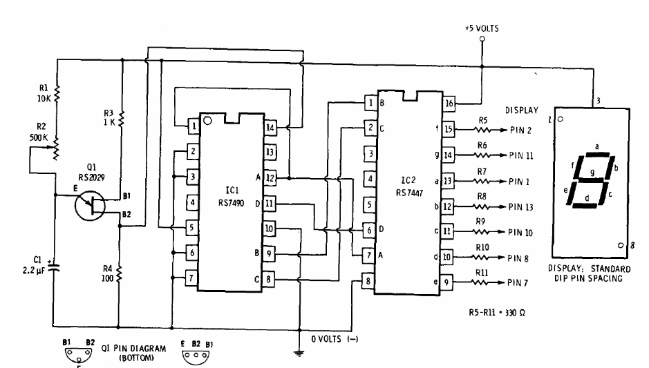 This circuit was obtained in a manual from the 1977 chain store Radio Shack. The circuit automatically counts at a speed determined by R2, which can be 470k. The unijunction transistor can be 2N2646 and the display is a common anode. The circuit can be expanded to more digits and TTL technology requires 5 V.