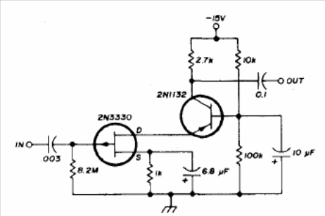 This circuit is from a 1976 technical documentation, providing a high input impedance with low output impedance for low intensity signals. The FET can be BF245 and the bipolar BC558. Observe the polarity of the supply that has a positive to earth. The circuit is suitable for applications with tuned audio and video signals.