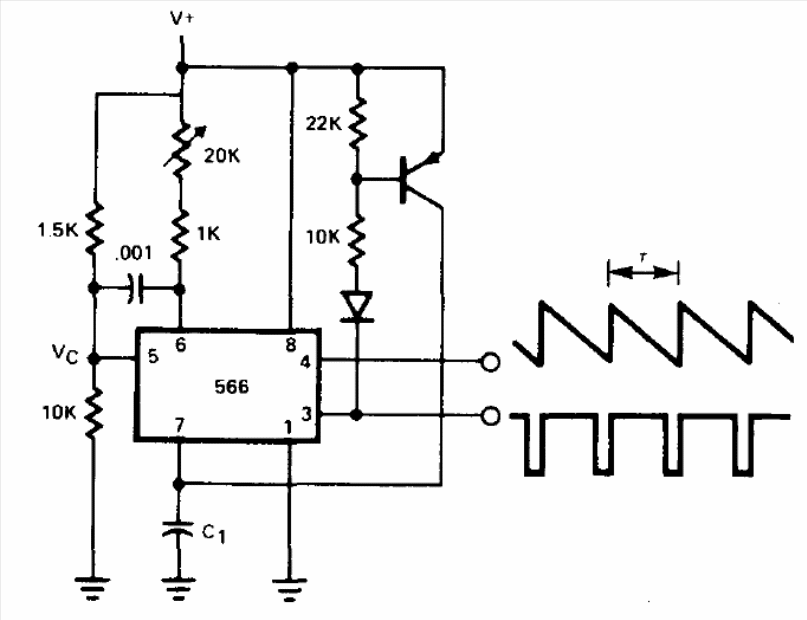 The 566 is a double 555. This circuit, found in a 1977 Signetics manual, generates a ramp whose period is given approximately by RC. The circuit can be powered by voltages from 5 to 12 V and the transistor can be a BC558. Components of non-standard values can be approximated to the most common current values.