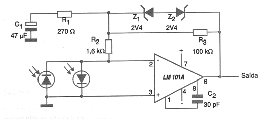 National Semiconductor suggests the circuit shown in the figure for amplifying signals from two photodiodes. The circuit is logarithmic, that is, it has its greatest gain with the small intensities of light falling on the diodes and as the intensity increases, the gain decreases when the two opposite zener diodes conduct, leading the circuit to unitary gain. The power supply must be symmetrical, and the largest gain is determined by R3. This component can be increased to obtain greater gain with lower light intensities. An interesting possibility is to replace R3 with a trimpot to obtain an adjustment of the dynamic operating range of the circuit. R1 also influences the circuit gain. The C2 capacitor does the frequency compensation and the photodiodes depend on the application, remembering that these components have a good frequency response for the modulated signals. Other operational amplifiers of the same characteristics can be tried out in this configuration.