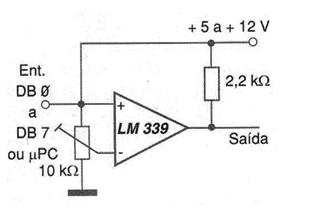 An interesting solution that can be provided in some cases is the one shown in the figure in which an adjustment trimpot is used. This adjustment trimpot allows you to bring the level of transition of the signal from the door where the trip is obtained to the ideal value. This allows even microprocessors that provide lower output voltages at their gates, such as some modern versions that provide 2.7 V or 3.3 V signals, can also be used in interfacing external circuits without having to change the circuit . Note that the reference resistors were calculated for two comparator supply voltages: 6 V and 12 V. For other voltages the reader can make the calculation, remembering that for a 5 V trigger output, the reference voltage level must be 2.5 V. Remember that the outputs of comparators LM139 / 239/339 are open collector, requiring a pull-up resistor. The maximum current drained by the output is 16 mA (tip) for a 5 V supply. This way, this step can directly excite transistors and other devices, with ease.