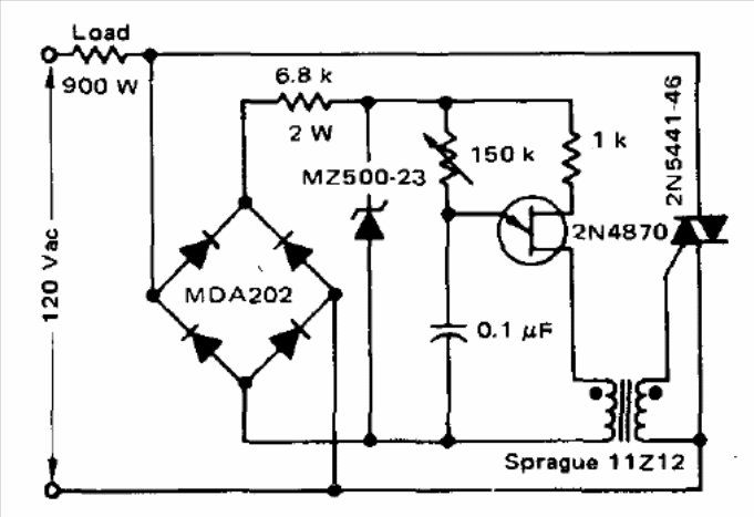This circuit generates two pulses per cycle of alternating voltage for full wave control. The circuit is from a Motorola publication from 1975 and can use triacs of the ICT series and the unijunction can be the 2N2646. The zener can have voltages from 15 to 25 V. The load depends on the Triac.