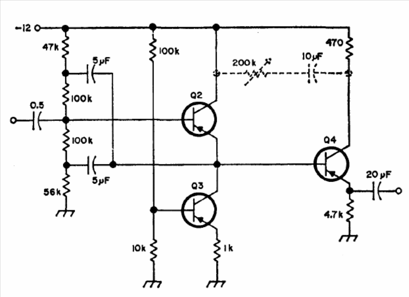 With this circuit, signals from 10 Hz to 220 Hz can be amplified with an input impedance of 10 M ohms. The circuit is from a 1974 publication, and current broadband transistors must be used, since the 2N2188 indicated in the original circuit is not easily obtained in the current component market. Capacitors and resistors with unusual values can be approximated to current standards.