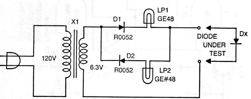 This old diode test, from a documentation from the 1970s, uses two small 6 V lamps up to 50 mA to indicate the state of a diode. The transformer has 6 V of secondary with at least 100 mA of current and the diodes can be 1N4002. If the two lamps light up the diode is shorted, if both remain off, the diode is open and if one of them just lights up, the diode is OK.