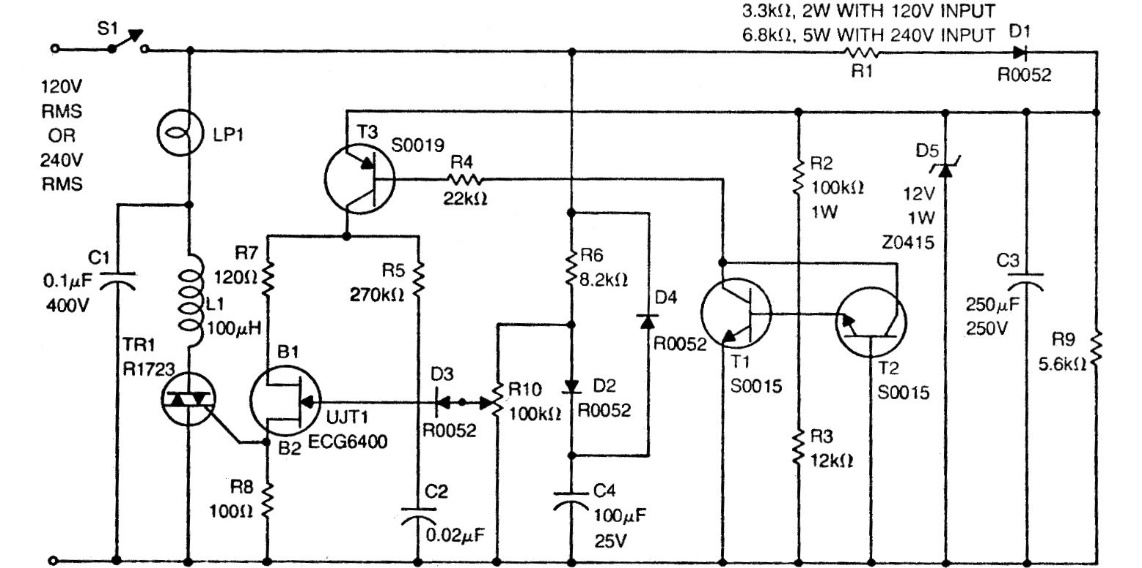 This circuit is from a publication from the 70s, but it can be implemented with modern components such as the TIC series triacs, 2N2646 as unijunction, BC548 for NPN transistors and BC558 for PNP. The diodes can be 1N4004 (110V) or 1N4007 (220V). The circuit can operate on the 110 V and 220 V network, but only with incandescent lamps. Approximate values of the components can be tested to obtain the best performance with the most modern equivalents.