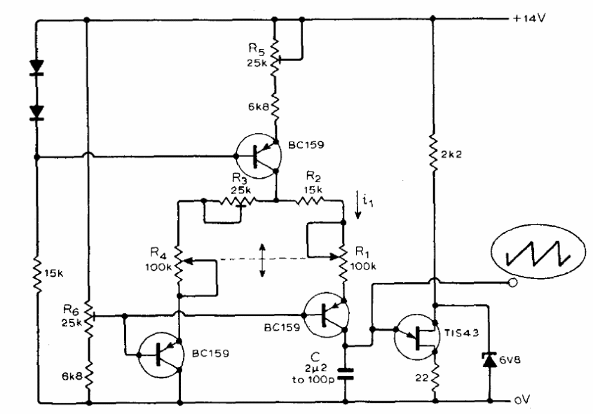 We found this circuit in an American publication in 1975. The circuit generates an adjustable sawtooth signal. The PNP transistors can be BC558 and the unijunction transistor 2N2646. The supply voltage is not critical, and the obtained waveform is linear. Diodes are commonly used like 1N4148.