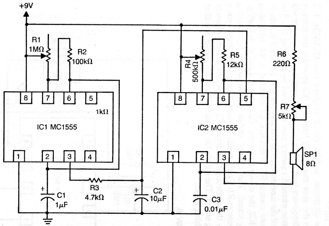 We found this circuit in an American publication from the 1970s. The MC1555 is the version of the 555 of the time. The common 555 can be used in the circuit. In this version, the power is low because there is no amplification step, but the signal from pin 3 of IC2 can be applied to a step with a transistor like the BD135 for greater sound intensity. The circuit can be powered by voltages from 6 to 12 V and the components can have their values changed to modify the effect.