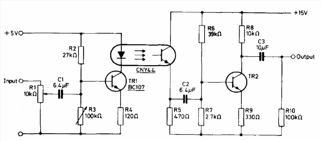 This circuit serves to isolate analog signals, for example, audio signals in a secure link application. The circuit is from a 1974 Mullard manual. The transistors can be the BC547 and the trimpot adjusts the operating point to avoid distortion.