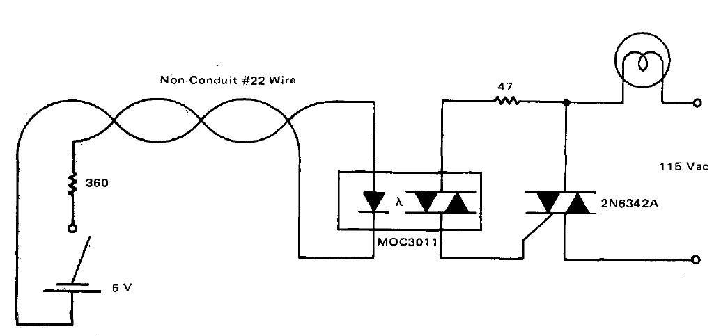 This circuit was obtained in a Motorola manual from 1978. We can use any triac and the coupler with trigger can be others of the same series, depending on the voltage. The controlled power depends on the triac. In the control we can use other voltages, just change the resistor of 360 ohms. For a 9 V battery, a 680 ohms resistor can be used.