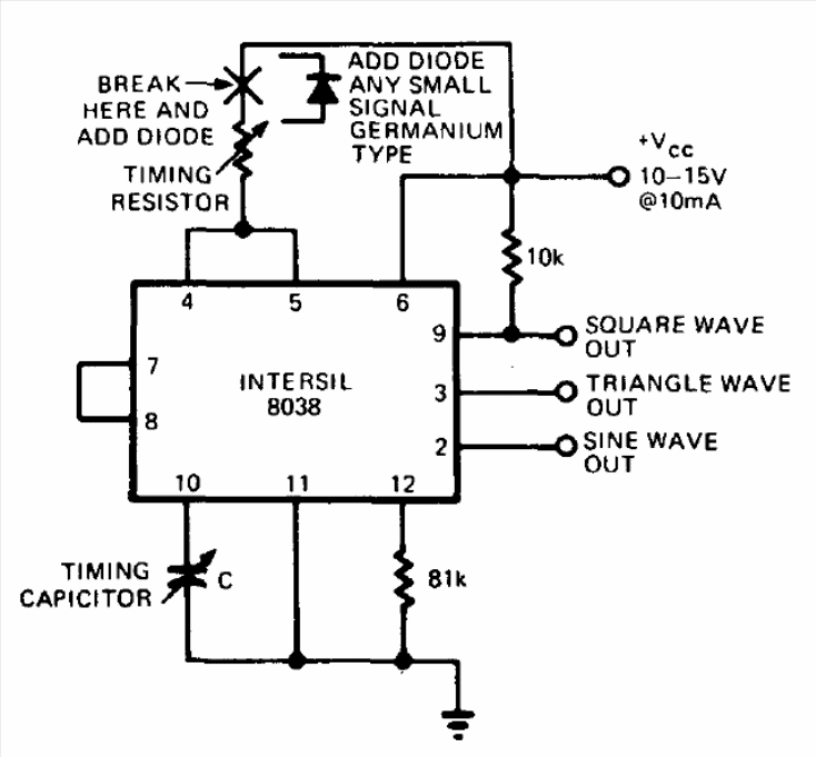 The 8038 integrated circuit consists of a function generator. This component, indicated in a 1974 circuit, is not very easy to obtain. The indicated circuit can generate signals from 5 to 100 kHz with 10 to 15 V supply and capacitor C can have values from 100 pF to 100 nF. The adjustment pot is 1 M.