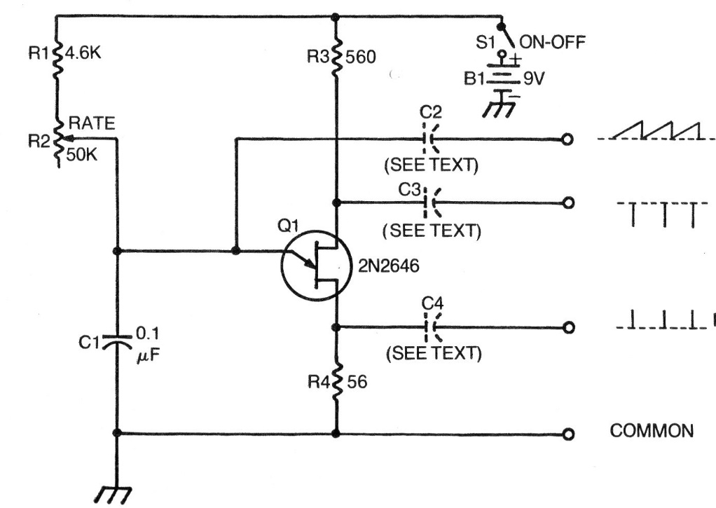 We found this basic circuit of a relaxation oscillator with unijunction transistor in a 1976 documentation. Capacitors can have values between 1 nF and 470 nF depending on the application and the power can typically be between 9 and 15 V. C1 and R2 / R1 determine the frequency and can be changed over a wide range of values.