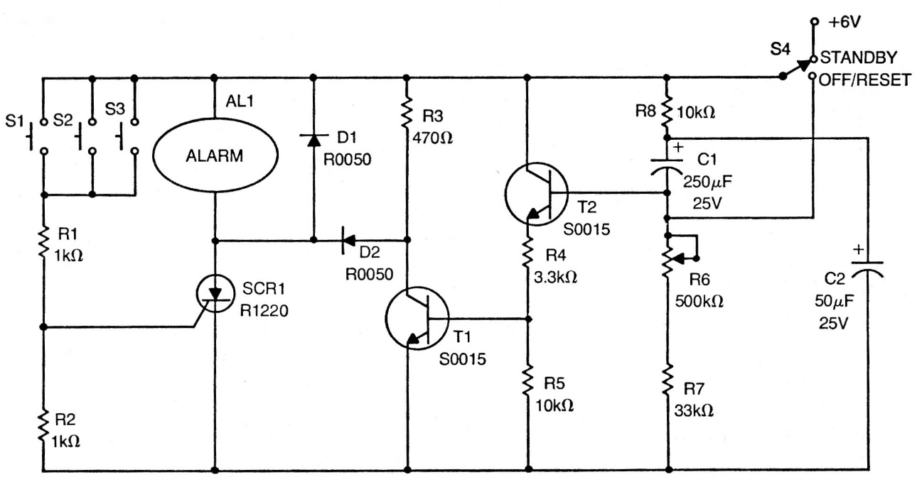 We found this circuit in an old American publication. It can be mounted with TIC106 type SCRs and BC548 transistors. The circuit has a locking system that arms the circuit after a certain time. Capacitors can have their values approximated by current standards. We suggest using a 12 V relay in place of the alarm and supplying the circuit with this voltage.
