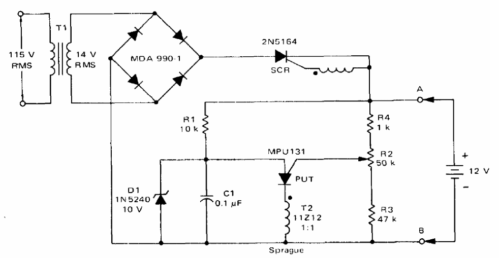 This circuit is from a 1974 technical documentation. The publication deals with applications of programmable unijunction transistors (PUT). Types equivalent to the one indicated can be used and the SCR can be one of the TIC series for currents of at least 8 A. The current of the transformer is 8 A or more and the transformer T2 is of the pulse type with a turn ratio of 1: 1.