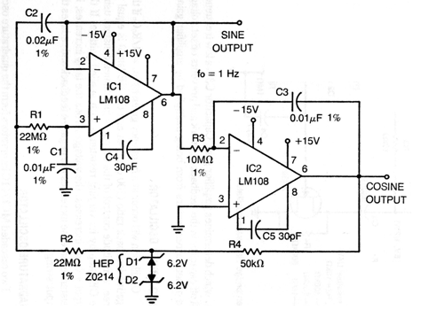 This circuit, found in a publication from the 1970s, produces a 1 Hz sinusoidal signal. Operational ones are uncommon today, but more modern equivalents like the 741 can be used. The circuit uses precision components in determining the frequency, but if not if necessary, components with common tolerances can be used. The power supply must be symmetrical.