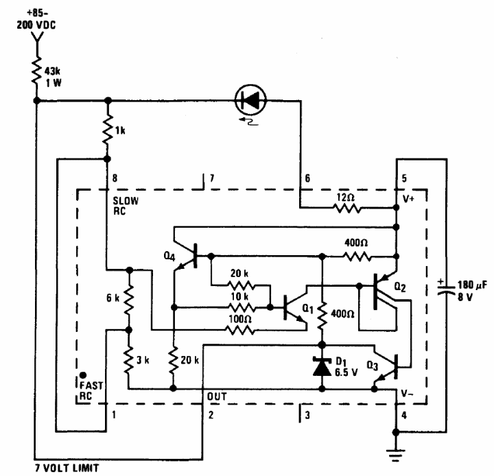 The presented circuit causes an LED to flash with voltages of 85 to 200 V continuous and has a low consumption. The base is a low-consumption IC from National Semiconductor. The blinking frequency is given by the external capacitor.