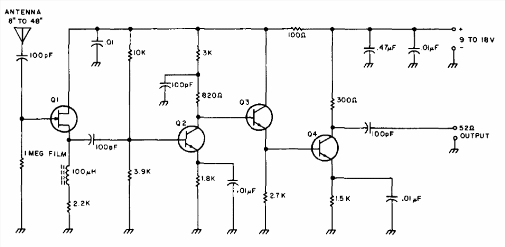 This circuit was obtained in a manual for radio amateurs from 1975. It is a circuit that allows the use of a telescopic antenna with receivers in the range of 3 to 30 MHz with excellent gain. The FET can be BF245 or MPF102 and the other transistors BF494.