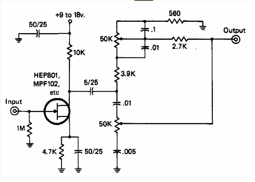 This circuit was obtained in an old publication. The FET can also be the BF245. The potentiometers can be 47k which are current standard values. The audio input and output cables must be shielded.