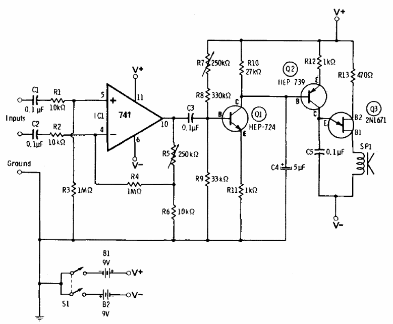 This electromyography monitor is from a 1978 publication on operational amplifiers. The components are common, and the transistors can be BC548 and BC558. The unijunction can be 2N2646. The circuit must be powered by battery only for safety reasons, since it is medical equipment.