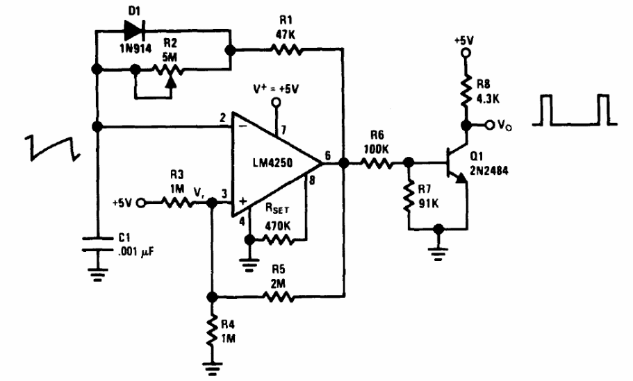 The circuit shown is a suggestion by National Semiconductor in its 1994 Linear Applications Handbook. The IC is not very easy to obtain and the transistor can be a 2N2222 or even BC548. The frequency is adjusted in R2.
