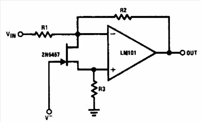 This configuration, from the 1977 National Semiconductor FET Databook, can be applied to other operators and the FET can be a BF245. The power supply must be symmetrical, and the basic gain is given by the resistors.