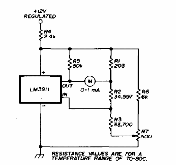 This circuit is from a 1977 National Semiconductor manual. The circuit directly indicates the temperature on a 0 to 1 mA instrument. The scale is in degrees Celsius from 70 to 80º C.