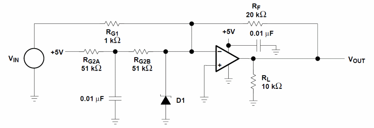 In the figure we have another configuration of inverter amplifier with gain 20 (in fact 19), suggested by Texas Instruments in technical documentation. Resistors Rf and Rg1 determine the gain. The output impedance is 10k and the circuit applies to Texas TL and TLC series amplifiers.