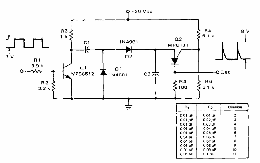 This circuit was obtained in a 1974 publication on Motorola PUT (Programmable Transistor Unijunction). The circuit divides rectangular signals into frequencies that depend on the components given in the table next to the diagram.