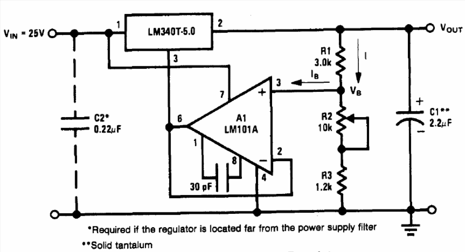We found this circuit in the Linear Applications Handbook of the National Semiconductor of 1994. The amplifier admits equivalents and the LM340 must be mounted in a good heat sink. 5A is the maximum output current.