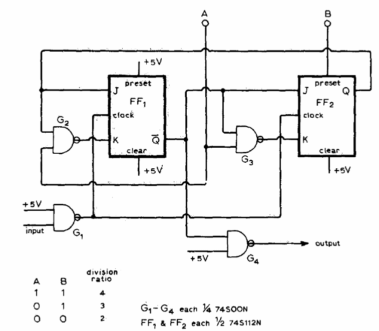 This circuit is from an old American publication. It divides a 40 to 60 MHz TTL signal by integer values such as 2, 3 or 4. The circuit must be powered by 5 V.