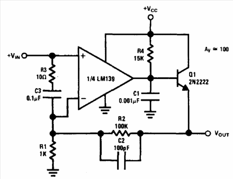 In the figure we show how to improve the performance of an operational amplifier with gain 100 using a comparator of the four of an LM139. The gain is given by R2, which can be changed. The output transistor supports an equivalent. The circuit is from National Semiconductor's Linear Applications Handbook.