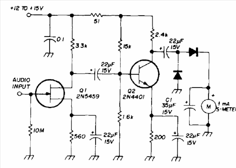 This configuration was found in a publication for radio amateurs in 1975. It is a signal strength meter for 1 mA indicators. The diodes are commonly used and the NPN transistor can be the BC548. The FET can be the BF245. The frequency response is 500 Hz to 10 kHz.