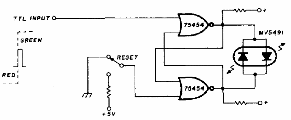 The resistors on this circuit from an American publication from the 70s are 220 ohms. The circuit captures an input pulse and locks, registering its presence. The circuit is ideal for detecting short pulses.