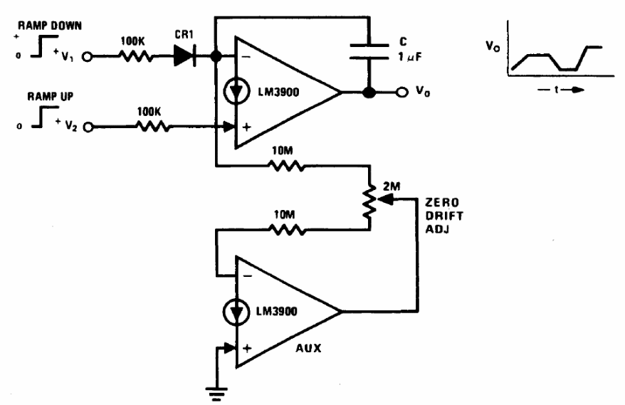 The circuit whose characteristics are given in the graph uses two transconductance operational amplifiers from an LM3900. The circuit is suggested by National Semiconductor in its 1994 Linear Applications Handbook.