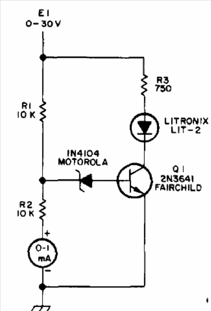We found this circuit in a 1977 technical documentation. Its purpose is to protect instruments against overloads. The zener is 20 V and the transistor can be a BD135. The indicator LED can be any color.