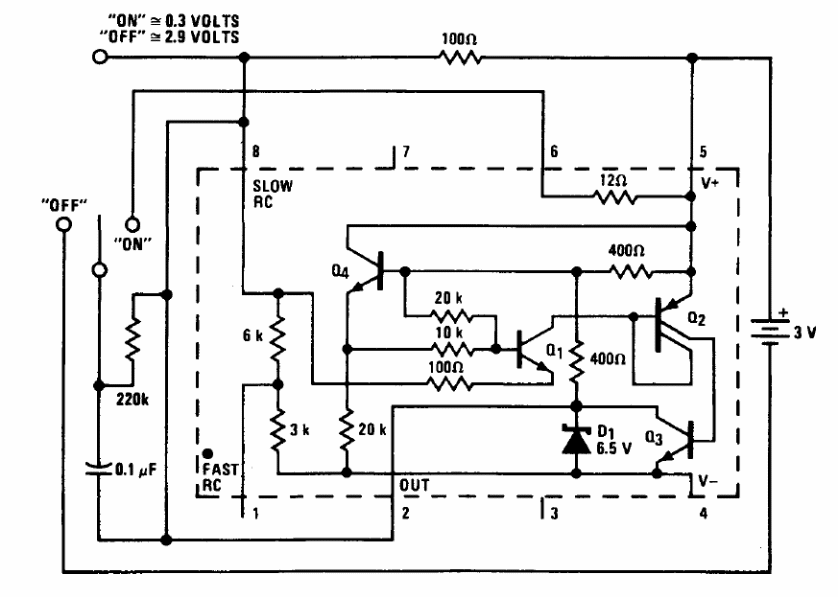 This latched switch configuration was obtained from National Semiconductor documentation on the LM3909. The circuit works with a 3 V power supply.