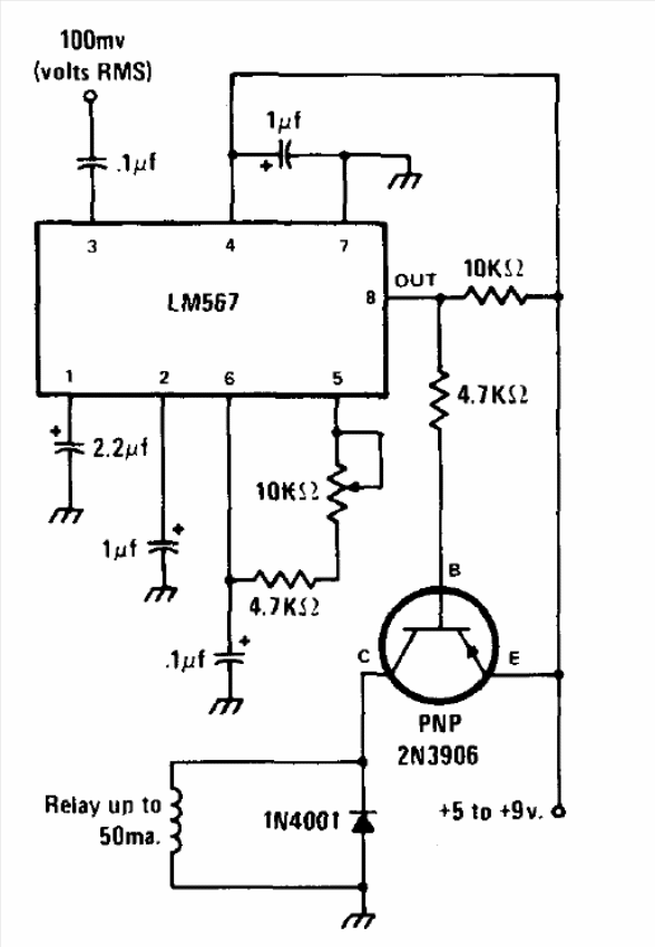 With the values of the components of this circuit, tone recognition can be done in the range of 700 to 1500 Hz. The capacitor on pin 6 can be changed to other times. The relay voltage must be according to the power supply and the transistor can be BC558. The circuit is from a 1978 publication.